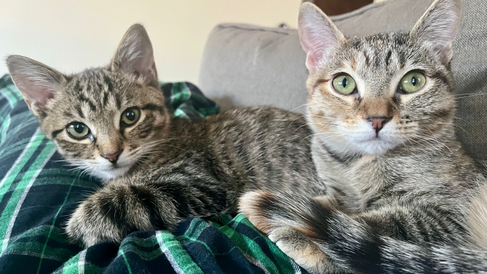 Meanwhile, Helvetica was on the verge of her own forever—she had an adopter lined up and was just days away from going home when she spiked a 106-degree fever. Tests pointed to Feline Infectious Peritonitis (FIP), a now treatable diagnosis. Helvetica began treatment immediately and showed remarkable resilience.